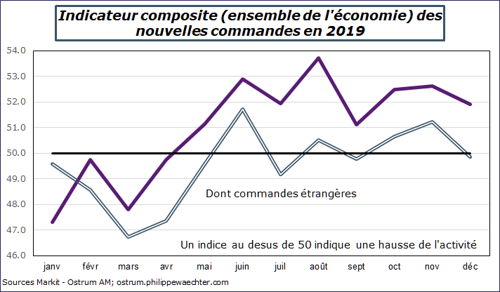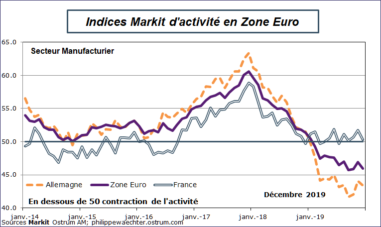 Depuis le début de l’année 2019, l’indicateur manufacturier français est au dessus du seuil de 50, indiquant ainsi une évolution robuste de l’activité du secteur alors que l’indice européen se contracte rapidement Sans amélioration en décembre. La situation est similaire en Allemagne.