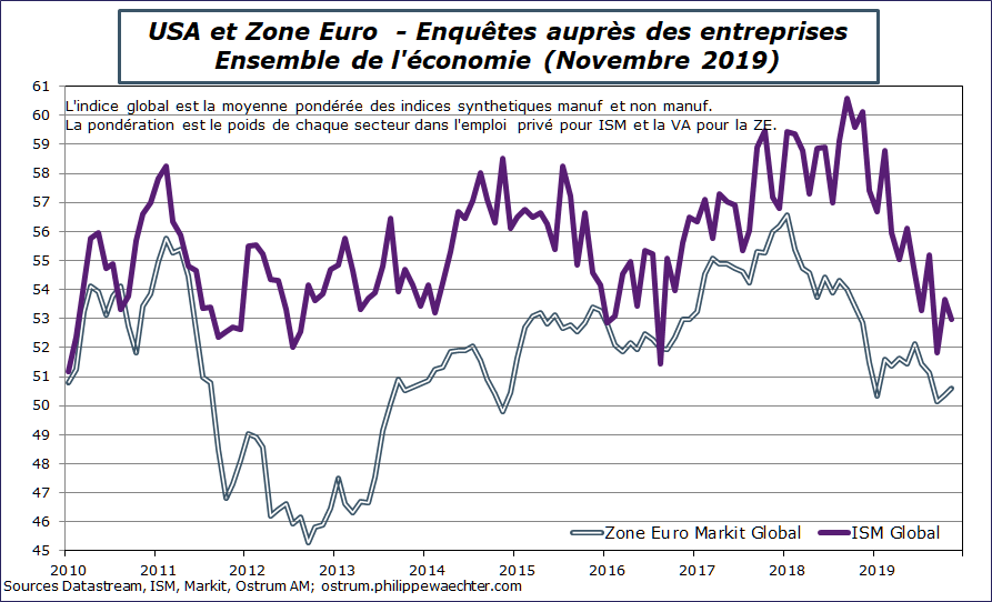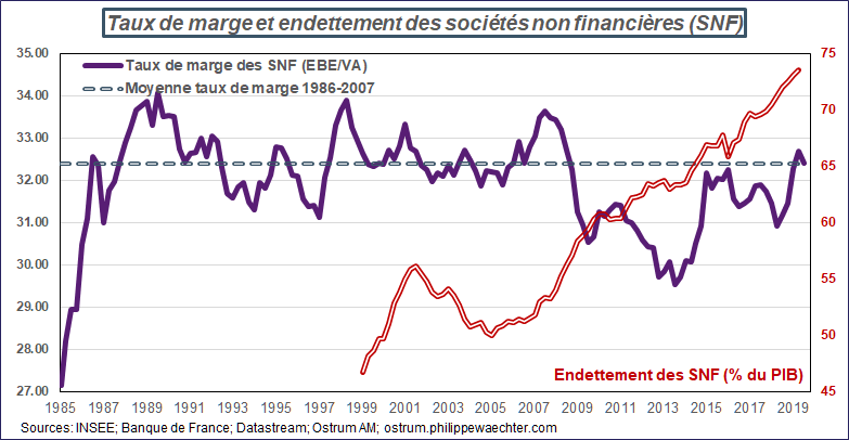 Le taux de marge est réduit en dépit du double effet, en 2019, du crédit d’impôts lié à la fin du CICE et des baisses de charge. La profitabilité des entreprises est faible. L’endettement des entreprises est au plus haut historique. Quelle serait la capacité des sociétés non financières à s’adapter en cas de choc négatif. C’est l’enjeu de 2020 en France mais aussi aux USA plus que dans les autres pays occidentaux. La dette des entreprises pourrait, aux USA et en France, être au cœur des risques (la dette des entreprises US est aussi au plus haut historique)