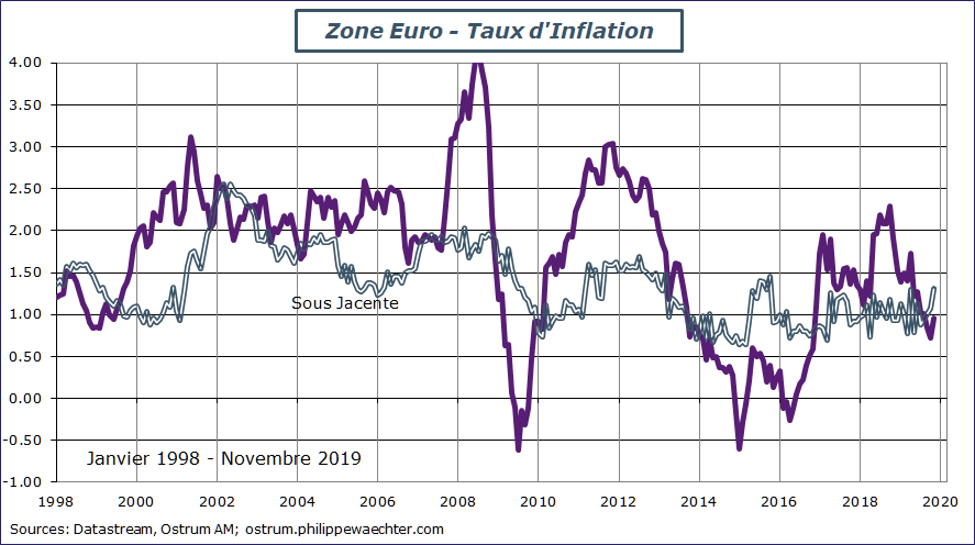 Depuis 2013, le taux d’inflation sous-jacent en zone euro oscille autour de 1% avec peu de volatilité. Les mouvements d’inflation résultent des fluctuations du prix du pétrole. Cette situation, que l’on peut généraliser aux pays développés, n’évoluera pas franchement en 2020.