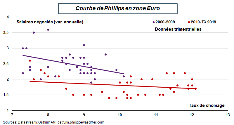 La courbe de Phillips ne fonctionne plus de façon efficace. La hausse de l’activité mesurée par la baisse du taux de chômage ne se transforme plus en pressions nominales. Par ailleurs et en déphasage avec le passé, les politiques monétaires accommodantes n’ont pas alimenté une hausse des anticipations d’inflation. Cela n’a donc pas engendré l’arbitrage de court terme que l’on pouvait lire chez Milton Friedman.