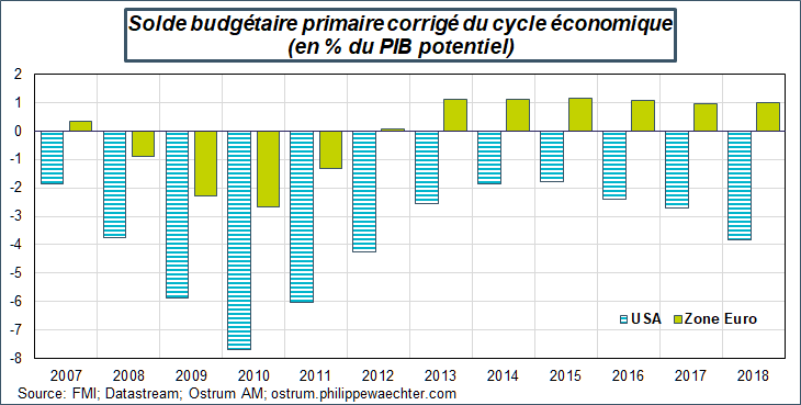 Le policy-mix est responsable de cela en zone euro. En dépit des demandes de Draghi, la politique budgétaire est restrictive depuis 2011 et freine la croissance de la zone. La BCE, en réaction, a adopté une stratégie hyper-accommodante pour compenser le biais budgétaire et limiter le risque sur l’expansion. La situation est plus équilibrée aux USA Si la zone Euro, notamment son secteur bancaire et financier, souffre de taux négatif, il faut qu’elle regarde du coté des gouvernements plutôt que vers la banque centrale. (voir ici, ici et ici)