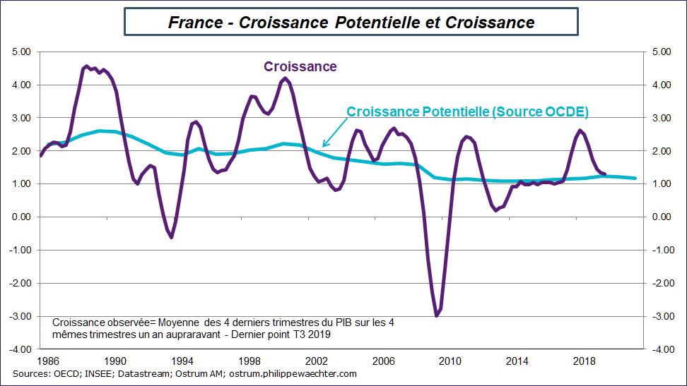 Sauf choc majeur externe, comme cela avait le cas en 2017, la croissance va rester sur sa tendance voisine de 1.2% Cela pourrait se traduire par une productivité qui n’évolue pas. La capacité à redistribuer davantage de revenus est donc limitée.