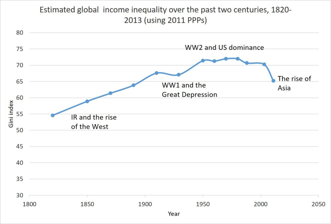 Tweet de Branko Milanovic à l’origine de ce graphe « This is global inequality (btw all citizens of the world) with the updated Bourguignon-Morrisson numbers (up to 1990). Afterwards it is Lakner-Milanovic and myself. [Unpublished] »