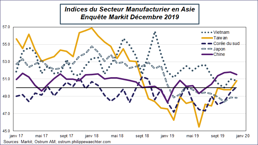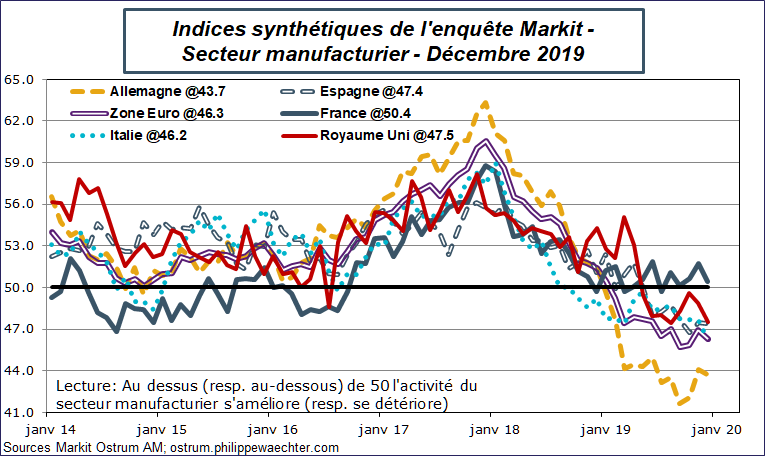 L’Europe continue d’avoir une dynamique macroéconomique fragile. La moindre contraction de l’activité manufacturière observée en novembre n’est pas franchement confirmée. Le redressement vers une moindre contraction s’arrête en zone Euro, en Allemagne et en Espagne. Ce n’est pas le cas de l’Italie qui retrouve un niveau très faible en fin d’année. La France oscille encore au dessus de 50 sans écart marquant par rapport à ce qui a été observé ces derniers mois. La situation de grève ne peut caractériser la dynamique française du mois de décembre. Il n’y a pas de rupture juste une allure cohérente avec les derniers mois