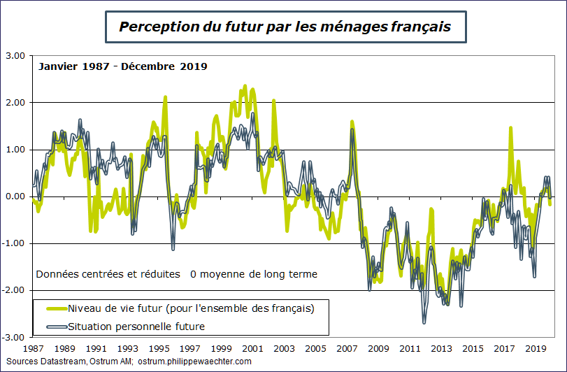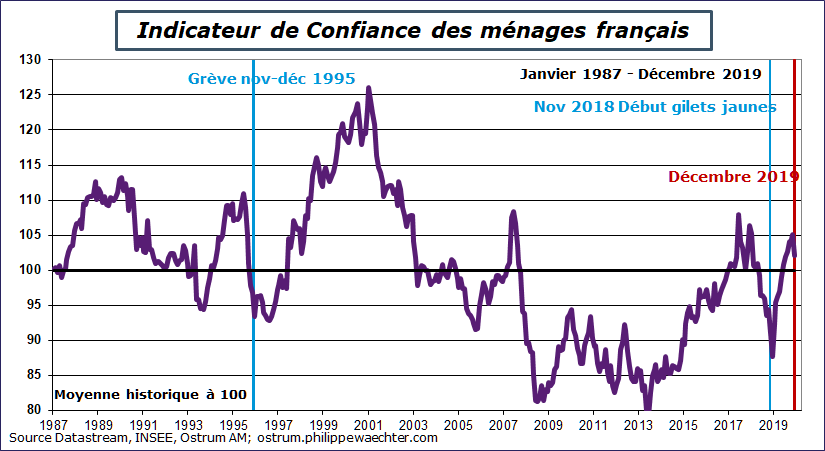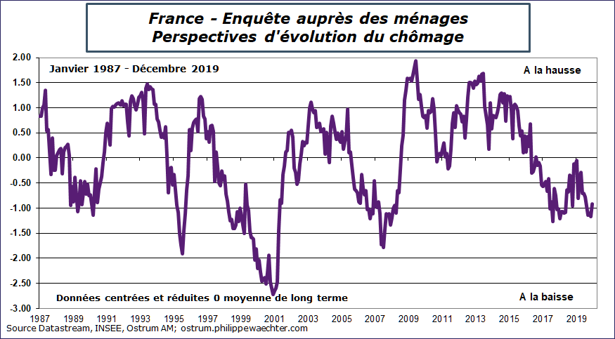 Jusqu’au mois de novembre, les français avaient la perception d’une amélioration continue de l’économie depuis le point bas de la fin 2018. Ce qui est particulier dans le cas présent est que par le passé, les grands mouvements sociaux s’observaient généralement après une forte baisse de l’indice de confiance. Ce n’est pas le cas en décembre 2019.