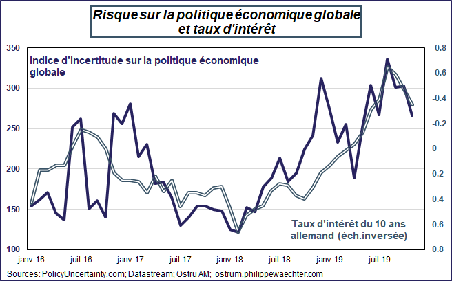 Une illustration du lien entre incertitude sur la politique économique et ajustement des comportements via l’allure du taux 10 ans allemand (actif sans risque). La baisse des taux depuis 2018 trouve sa source dans le caractère non coopératif de la politique économique et de l’incertitude que cela engendre.